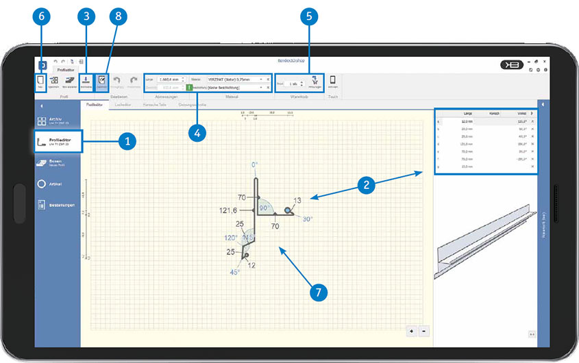 - Bestimmen Sie Länge und Zuschnittbreite des Profils sowie Material, Materialstärke und Farbe.